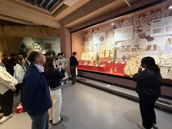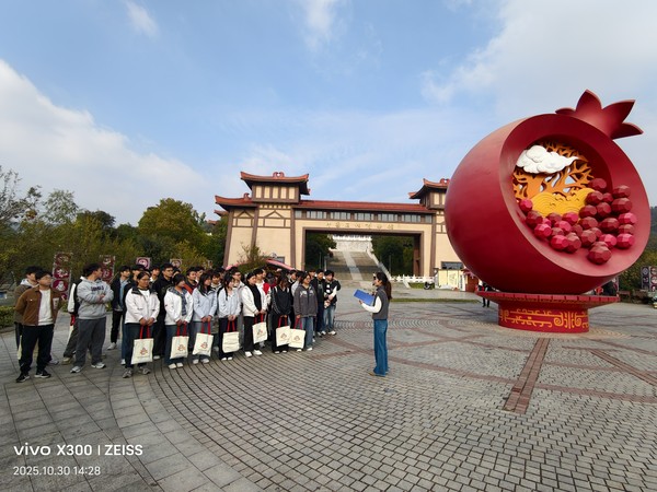 随后,师生跟随讲解员追溯石榴从西域传入中原的千年文脉,通过汉代画像砖、唐代铜镜等文物,感受"“丝绸之路”的文化交融;在"当代石榴"展区,了解本地依托石榴产业助力乡村振兴的实践,直观体会"绿水青山就是金山银山"的发展理念。